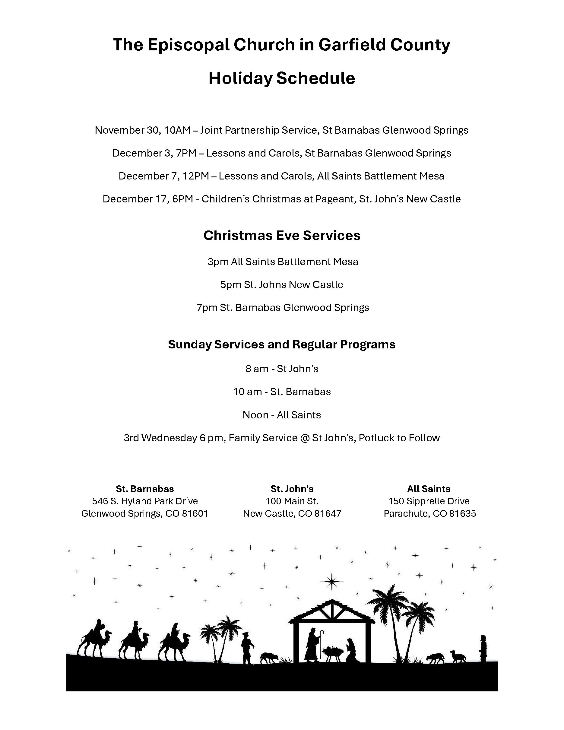 In the first century, Jesus started a movement simply called “the way.” As part of the Episcopal Church in Garfield County and the national Episcopal Church, we are committed to the Jesus Movement by living the “way of love” out into the world. We are a work-in-progress and together we are on a mission to grow in faith and better learn to love God, love neighbor, and love self so that all creation thrives. Please join us!